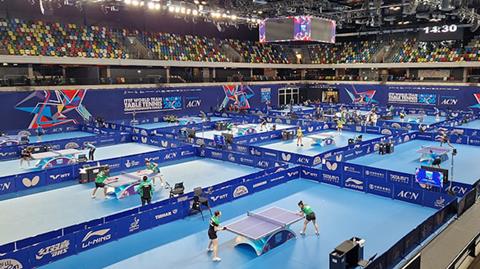 The table tennis tournament competes across 12 tables simultaneously, all streamed live for free on YouTube
