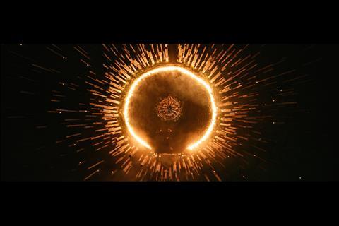 “There’s a VFX hole in the ceiling of the dilapidated building,” says VFX supervisor Dean Koonjul. “The camera pans up through the gap and out into the grim, derelict environment beyond. We extended and aged the surroundings and added tall, industrial, stupa-like chimneys—a precursor to what we see later in the film at the Bone Temple itself.”